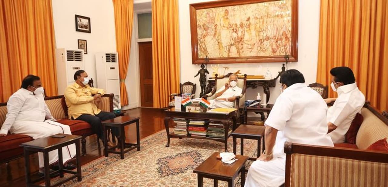 இன்று (22 12 2020) மாண்புமிகு தமிழ்நாடு ஆளுநர் திரு பன்வாரிலால் புரோகித் அவர்களை திராவிட முன்னேற்ற கழக தலைவர் மு.க ஸ்டாலின், திமுக பொதுச்செயலாளர் துரைமுருகன், பொருளாளர் டி.ஆர் பாலு, துணைப் பொதுச் செயலாளர் ஆ.ராசா, அமைப்பு செயலாளர் ஆலந்தூர் ஆர்.எஸ் பாரதி, செய்தி தொடர்பாளர் டி.கே.எஸ் இளங்கோவன் உள்ளிட்டோர் சந்தித்து, முதலமைச்சர் திரு. எடப்பாடி பழனிச்சாமி தலைமையிலான தமிழ்நாடு அமைச்சரவையில் 97 பக்கம் ஊழல் புகார்கள் அடங்கிய மனு அளிக்கப்பட்டது.