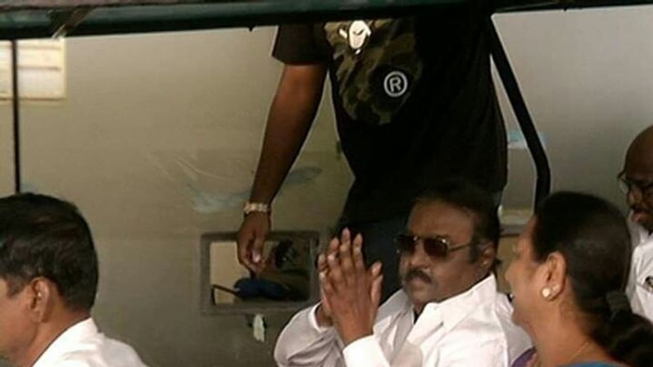 இந்நிலையில், சரியாக 12 மணி நேரத்துக்குப் பின் இன்று பகல் 12.15 மணிக்குதான் விஜயகாந்த் விமான நிலையத்தில் இருந்து வெளியே வந்தார். வழக்கமான அரசியல் உடையான வேட்டி சட்டையில் கையெடுத்து கும்பிட்டபடியே வெளியே வந்தார் விஜயகாந்த்.