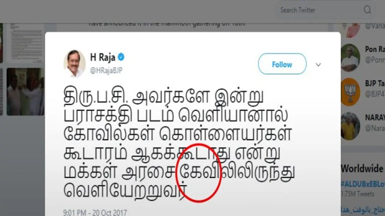 இந்த பதிவில் கோவிலிலிருந்து என்பதற்குப் பதிலாக கேவிலிலிருந்து என பதிவிட்டுள்ளார். கோவில் என்ற வார்த்தையைக் கூட சரியாக எழுத தெரியவில்லை. இவர் மற்றவர்களை விமர்சனம் செய்கிறார். முதலில் சரியாக எழுத கற்றுக்கொள்ளுங்கள் என நெட்டிசன்கள் ராஜாவை வறுத்தெடுக்கின்றனர். வெளியேற்றுவர் என்ற வார்த்தையையும் கூட தவறாகவே ராஜா பதிவிட்டிருந்தார்.