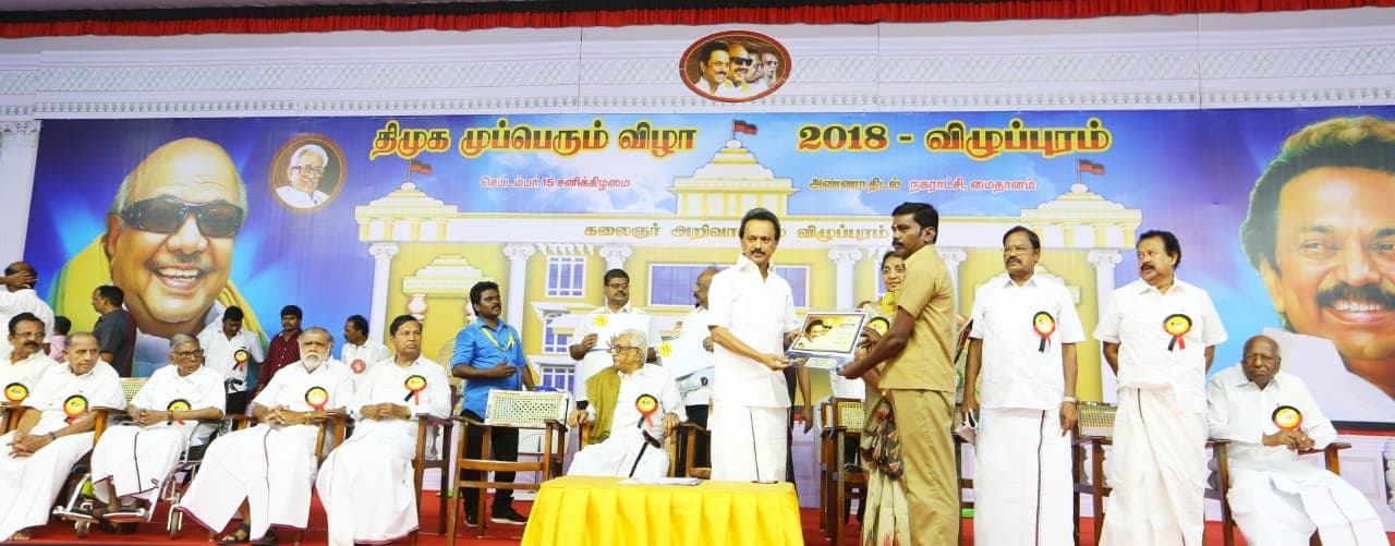 திமுகதலைவர்மு.க.ஸ்டாலின்தலைமையில்விழுப்புரத்தில்முப்பெரும்விழாநடைபெற்றது இந்தவிழாவில்முரசொலிஅறக்கட்டளைசார்பில்பரிசுகள்மற்றும்நலத்திட்டஉதவிகள்வழங்கப்பட்டன.