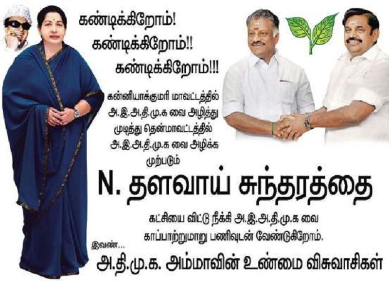 கன்னியாகுமரி மாவட்டத்தில் அதிமுகவை அழித்துவிட்டு, தற்போது நெல்லை, தூத்துக்குடி, விருதுநகர் மாவட்டங்களில் கட்சியை அழிப்பதற்கு தளவாய் சுந்தரம் கோஷ்டி அரசியல் செய்து வருவதாகவும், அவர் டி.டி.வி.தினகரனின் கைக்கூலியாக செயல்படுவதாகவும் அவரை உடனடியாக கட்சியைவிட்டு நீக்க வேண்டும் என்றும் தென் தமிழகத்தில் பல இடங்களில் ஒட்டப்பட்டுள்ள வால் போஸ்டர்களால் பரபரப்பு ஏற்பட்டுள்ளது.