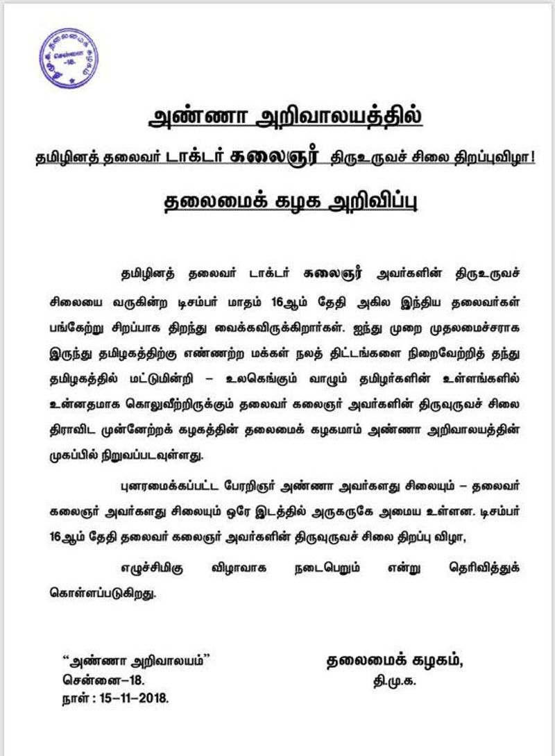 முன்னாள் முதல்வரும், திமுக தலைவருமான கருணாநிதி, கடந்த ஆகஸ்ட் 7-ம் தேதி மரணம் அடைந்தார். அவரது சிலையை, வரும் 15-ம் தேதி நிறுவ திட்டமிடப்பட்டது. ஆனால் பல்வேறு காரணங்களுக்காக சிலை திறப்பு விழா, அடுத்தமாதம் 16-ம் தேதிக்கு ஒத்திவைக்கப்பட்டது.