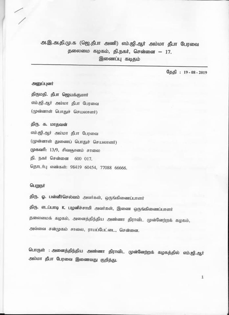 அதில் தீபா மற்றும் மாதவன் இருவரும் முன்னாள் பொதுச் செயலாளர் மற்றும் முன்னாள் துணைப் பொதுச்செயலாளர் என முறையே கையெழுத்து போட்டு உள்ளனர் .