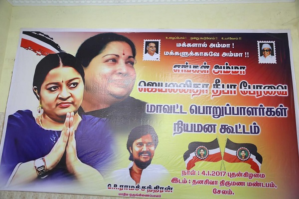 ஜெயலலிதா காலமானதையடுத்து அதிமுக வை அவரின் தோழி சசிகலா கைப்பற்றிக் கொண்டார். ஆனால் அதிமுக வின் அடிமட்டத் தொண்டர்கள் சசிகலாவை விரும்பவில்லை. ஜெயலலிதாவின் அண்ணன் மகள் தீபாவுக்கு ஆதரவு தெரிவித்து தமிழகம் முழுவதும் பேனர்கள் பிளக்ஸ்கள் வைக்கப்பட்டுள்ளன.