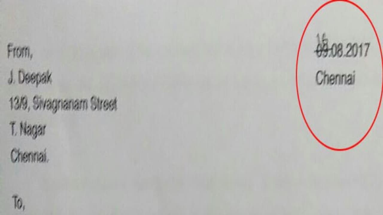 மேலும் முதல்வருக்கு தீபக் எழுதியுள்ள கடிதத்தில் தேதி மாறி மாறி உள்ளதால் குளறுபடி ஆகியுள்ளது. ஆகஸ்ட் 9ம் தேதியில் கடிதம் எழுதப்பட்டு பின் ஆகஸ்ட் 16ம் தேதி என்று மாற்றப்பட்டு உள்ளது.