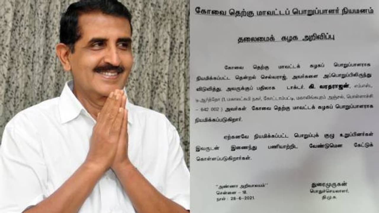 திமுக பொதுச்செயலாளர் துரைமுருகன் வெளியிட்டுள்ள அறிக்கையில், ’’கோவை மாவட்ட திமுக பொறுப்பாளராக நியமிக்கப்பட்ட தென்றல் செல்வராஜ் அப்பொறுப்பில் விடுவிக்கப்படுகிறார். அவருக்கு பதிலாக டாக்டர். கி. வரதராஜன் அந்த பெறுப்பில் நியமிக்கப்படுகிறார் என்று கூறப்பட்டுள்ளது.மேலும் நியமிக்கப்ப்டட கோவை தெற்கு திமுக பொறுப்பாளர் வரதராஜனுடன் இணைந்து பணியாற்ற வேண்டும் என்றும் துரைமுருகன் வெளியிட்ட அறிக்கையில் கூறப்பட்டுள்ளது. கி.வரதராஜன் ஆர்தோ மருத்துவராக உள்ளார். மேலும் நடந்து முடிந்த சட்டமன்ற தேர்தலில் பொள்ளாச்சி தொகுதி திமுக வேட்பாளராக களமிறங்கி தோல்வியை தழுவினார். தோல்விக்கு கட்சிக்கு இருந்த பூசல்களே காரணம் என உடன்பிறப்புகள் மேலிடத்தில் புகாரளித்தனர்.