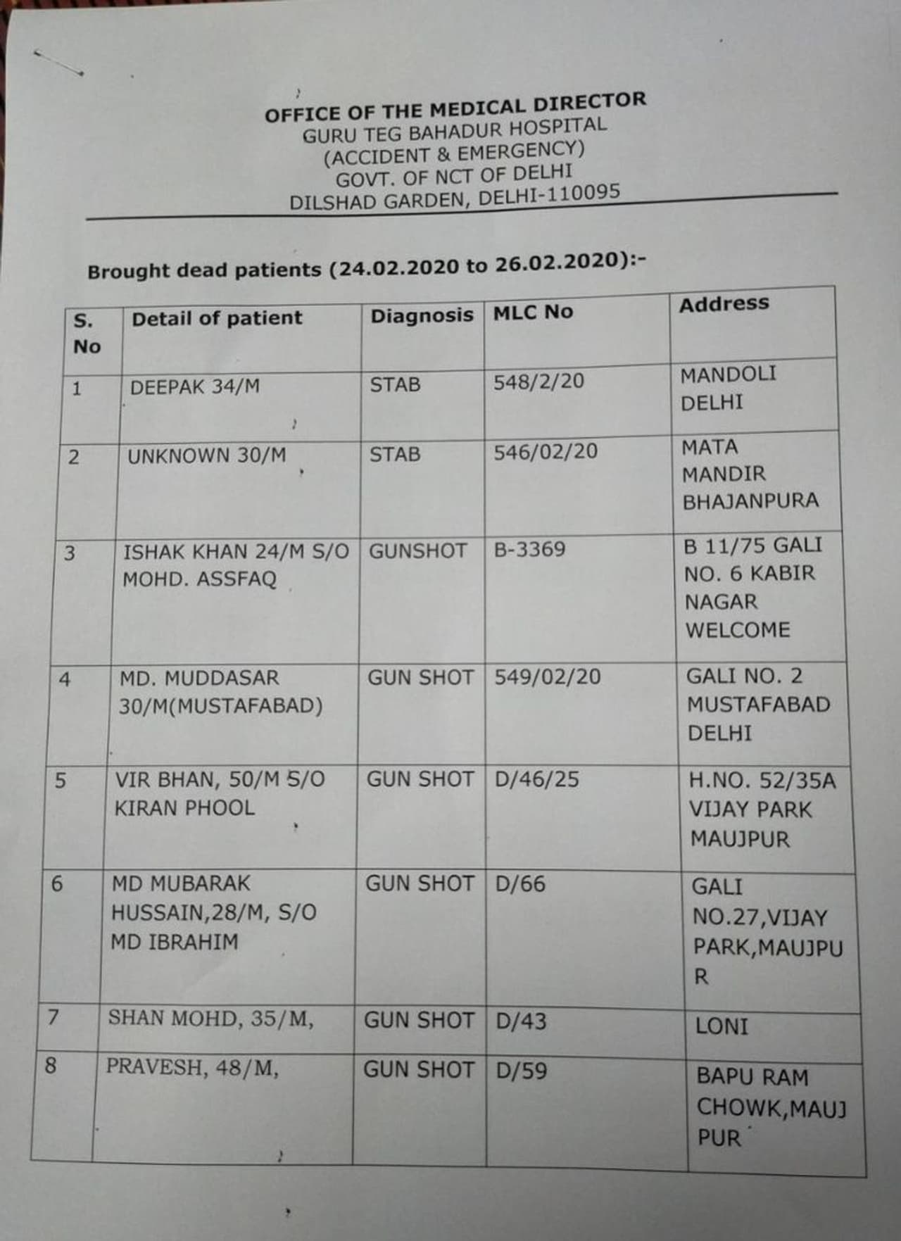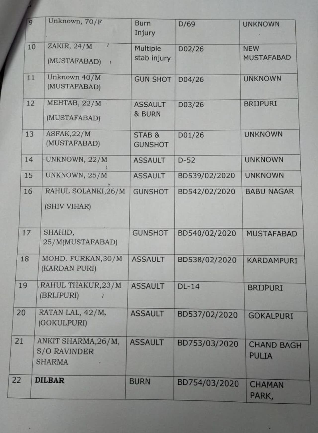 டெல்லி பகதூர் அரசு மருத்துவமனை இயக்குனர் அலுவலகத்தில் இருந்து டெல்லி வன்முறையில் பலியானவர்கள் பட்டியல் வெளியிட்டுள்ளது.அதில் துப்பாக்கி சூட்டில் 12 பேரும், தீ காயத்தில் 3பேரும்,குத்தி கொலை செய்யப்பட்டவர்கள் 7பேர் எனவும் வெளியிடப்பட்டுள்ளது.