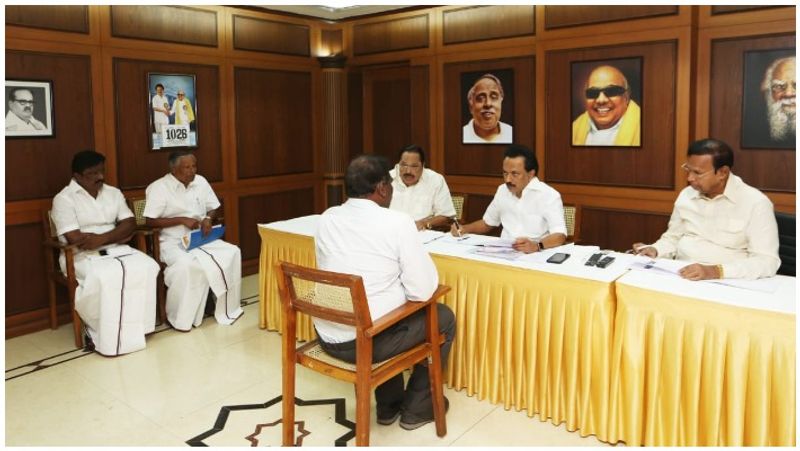மக்களவை தேர்தல் மற்றும் 21 தொகுதிகளுக்கான சட்டமன்ற இடைத்தேர்தலுக்கான நேர்காணலை நடத்தி வருகிறது திமுக தலைமை. மக்களவை தேர்தலில் புதுவை மற்றும் தமிழகத்தில் உள்ள 40 தொகுதிகளில் 20 தொகுதிகளை கூட்டணிக்கட்சிகளுக்கு பங்கு பிரித்துக் கொடுத்துவிட்ட திமுக 20 தொகுதிகளில் களம் காண இருக்கிறது. இந்நிலையில் திமுக போட்டியிட உள்ள தொகுதிகளில் போட்டியிட விருப்ப மனு அளித்தவர்களிடம் நேர்காணல் நடைபெற்று வருகிறது. பல தொகுதிகளில் போட்டியிட ஒன்றுக்கும் மேற்பட்டவர்கள் விருப்பமனு தாக்கல் செய்துள்ளனர்.