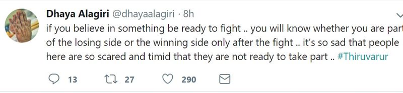அதில், "நீங்கள் ஒரு விஷயத்தில் நம்பிக்கை வைத்திருந்தீர்கள் என்றால் துணிந்து போராடுங்கள்... நீங்கள் வெற்றி பெறுவீர்களா அல்லது தோல்வி பெறுவீர்களா என்பதெல்லாம் நீங்கள் போட்டியை எதிர்கொண்ட பிறகுதான் தெரியும். ஆனால், இங்கே சிலர் போட்டியை எதிர்கொள்ளவே துணிவில்லாமல் அச்சமடைகின்றனரே" எனப் பதிவிட்டிருக்கிறார். இடைத்தேர்தலை எதிர்கொள்ள அச்சமடைகிறார்கள் என்று துரை தயாநிதி திமுக தலைவரும் தனது சித்தப்பாவுமாகிய ஸ்டாலினை கலாய்த்துள்ளது தெளிவாக தெரிகிறது.