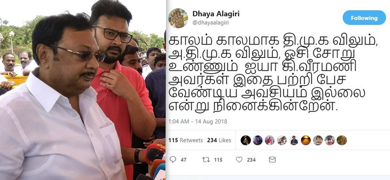 இதற்கு பதிலடி கொடுத்த முக அழகிரியின் மகன் துரை தயாநிதி டிவீட் செய்துள்ளார். அதில், காலம் காலமாக தி.மு.க விலும், அ.தி.மு.க விலும், ஓசி சோறு உண்ணும் ஐயா கி.வீரமணி அவர்கள் இதை பற்றி பேச வேண்டிய அவசியம் இல்லை என்று நினைக்கின்றேன் என திராவிடக் கழகத் தலைவர் வீரமணியை மானபங்கப் படுத்தியுள்ளார். துரை தயாநிதியின் இந்த பதிலால் ஒரு பெரிய மனுஷனை ஓசி சோறு என திட்டுவதா? வயசுக்கு ஒரு மரியாதை கொடுக்க வேண்டாமா? என துரை தயாநிதிக்கு கண்டனம் தெரிவித்திருந்தனர்.