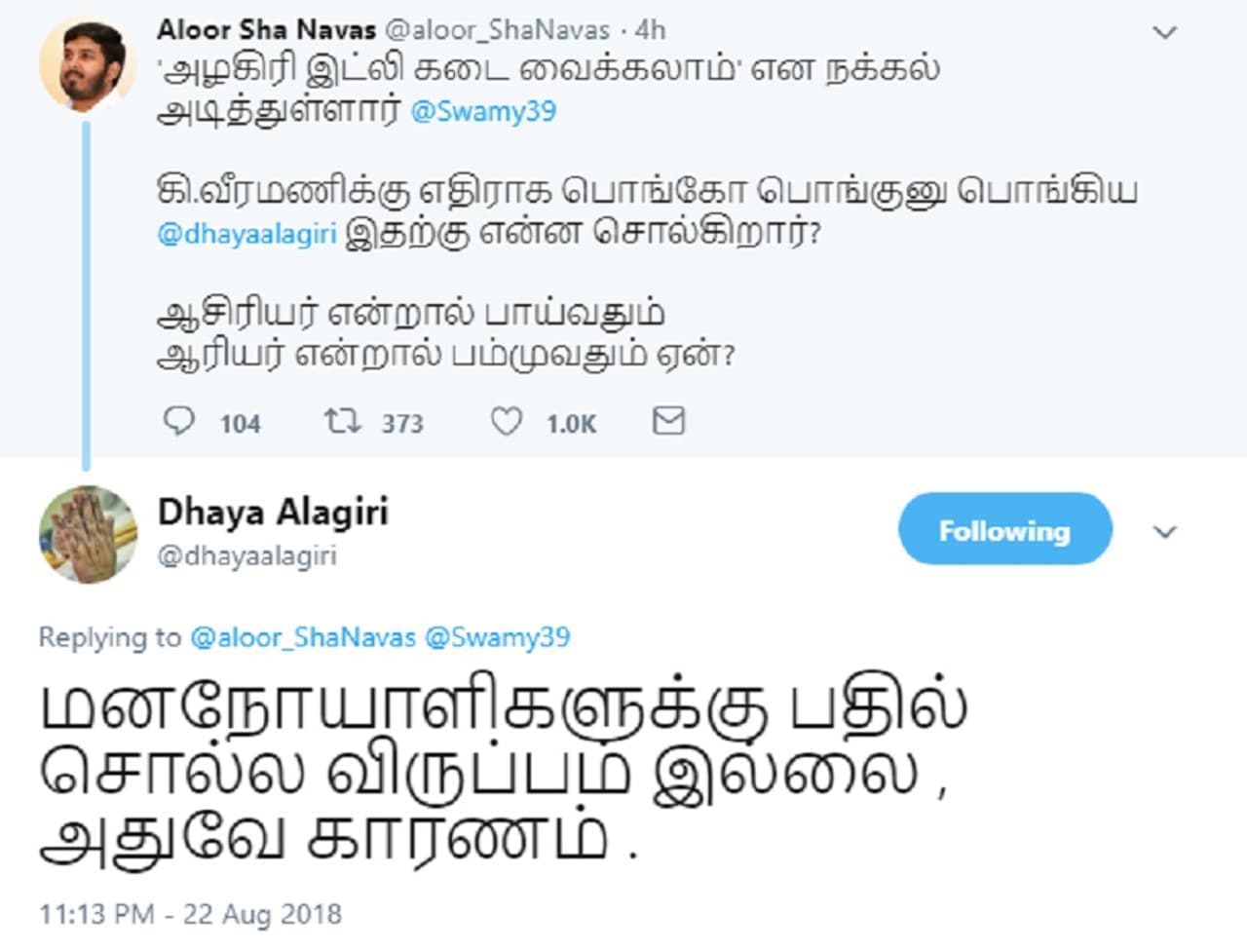 இதனையடுத்து, விடுதலை சிறுத்தை கட்சியைச் சேர்ந்த ஆளூர் ஷாநவாஸ் தனது டிவிட்டர் பதிவில், 'அழகிரி இட்லி கடை வைக்கலாம்' என நக்கல் அடித்துள்ளார் சுப்பிரமணியன் சுவாமி. கி.வீரமணிக்கு எதிராக பொங்கோ பொங்குனு பொங்கிய அழகிரி இதற்கு என்ன சொல்கிறார்? ஆசிரியர் என்றால் பாய்வதும் ஆரியர் என்றால் பம்முவதும் ஏன்? என அழகிரியின் மகன் துரை தயாநிதியை டேக் செய்து கேள்விஎழுப்பினார்.