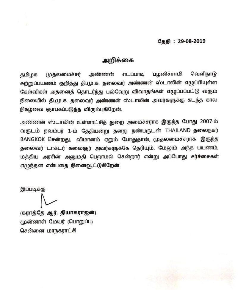 மு.க.ஸ்டாலின் உள்ளாட்சித்துறை அமைச்சராக இருந்தபோது 2007-ம் ஆண்டு நவம்பர் 1-ம் தேதியன்று தனது நண்பர்களுடன் தாய்லாந்து தலைநகர் பாங்காங் சென்றது விமானம் ஏறும் போது தான் முதலமைச்சராக இருந்த தலைவர் கருணாநிதிக்கே தெரியும். மேலும் அந்தப்பயணம் மத்திய அரசின் அனுமதி பெறாமல் சென்றார் என்று அப்போது சர்ச்சைகள் எழுந்தன என்பதை நினைவூட்டுகிறேன்’’ என தனது அறிக்கையில் தெரிவித்துள்ளார்.