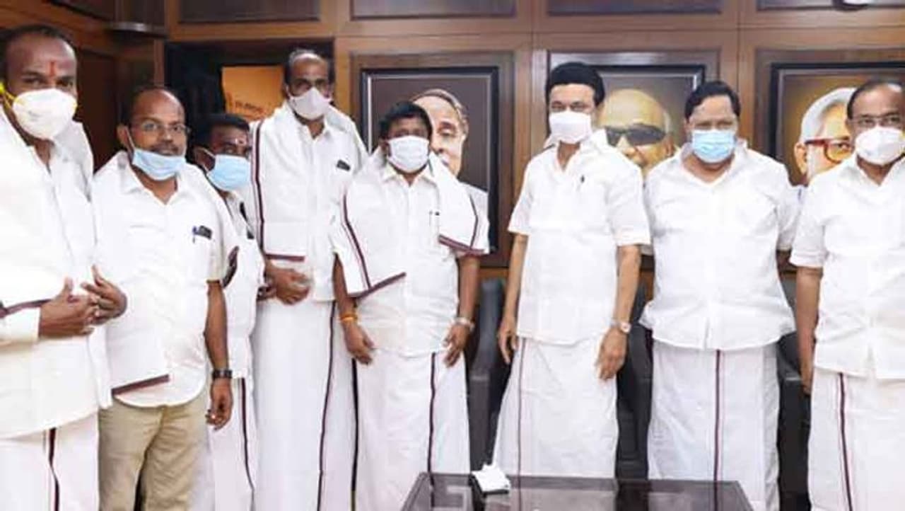 சென்னை அண்ணா அறிவாலயத்தில் திமுக தலைவரும், முதல்வருமாக மு.க.ஸ்டாலின் முன்னிலையில் திண்டுக்கல் மேற்கு மாவட்ட தேமுதிக செயலாளர் எஸ்.ஆர்.கே.பாலு தலைமையில் முக்கிய நிர்வாகிகள் திமுகவில் இணைந்து விஜயகாந்துக்கு அதிர்ச்சி கொடுத்துள்ளனர்.