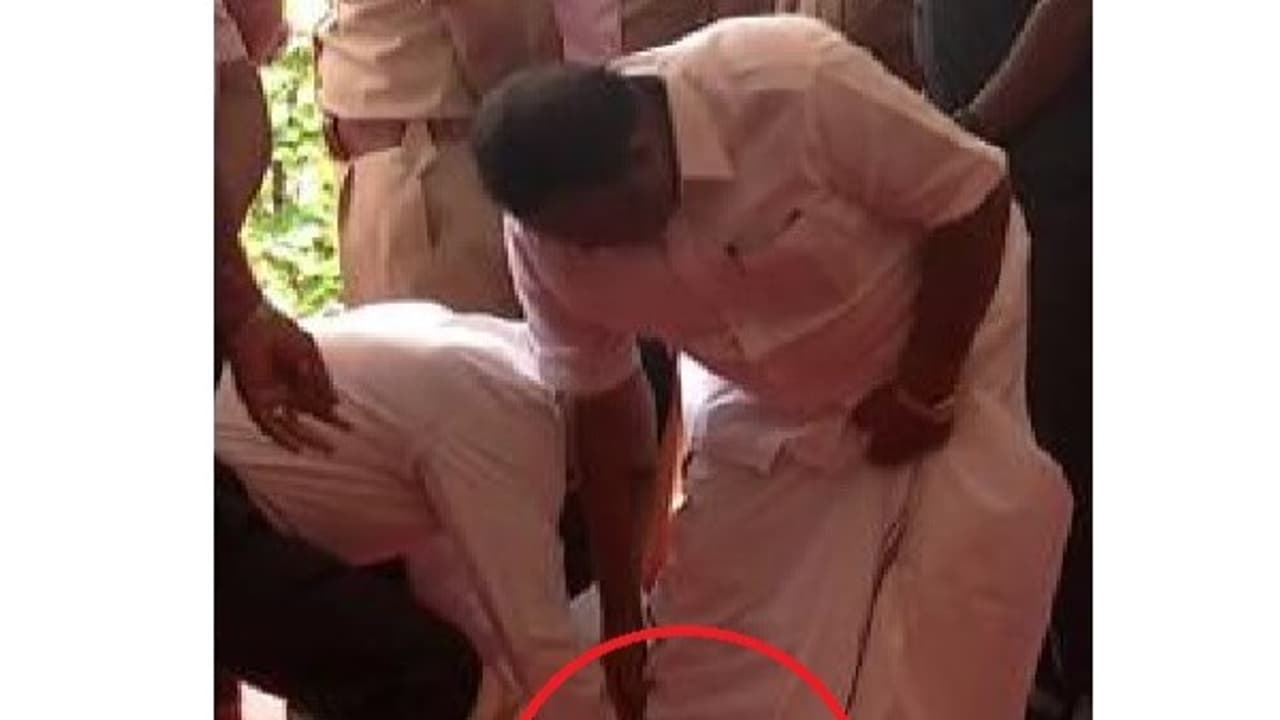 படத்துக்கு மரியாதை செலுத்தி விட்டு அமைச்சர் திண்டுக்கல் சீனிவாசன் காலணி அணியும்போது, அவரது உதவியாளர் கீழே குணிந்து அவரது காலணியை அணிவித்து விட்ட காட்சி தற்போது சமூக வலைத்தளத்தில் வேகமாக பரவி வருகிறது.
