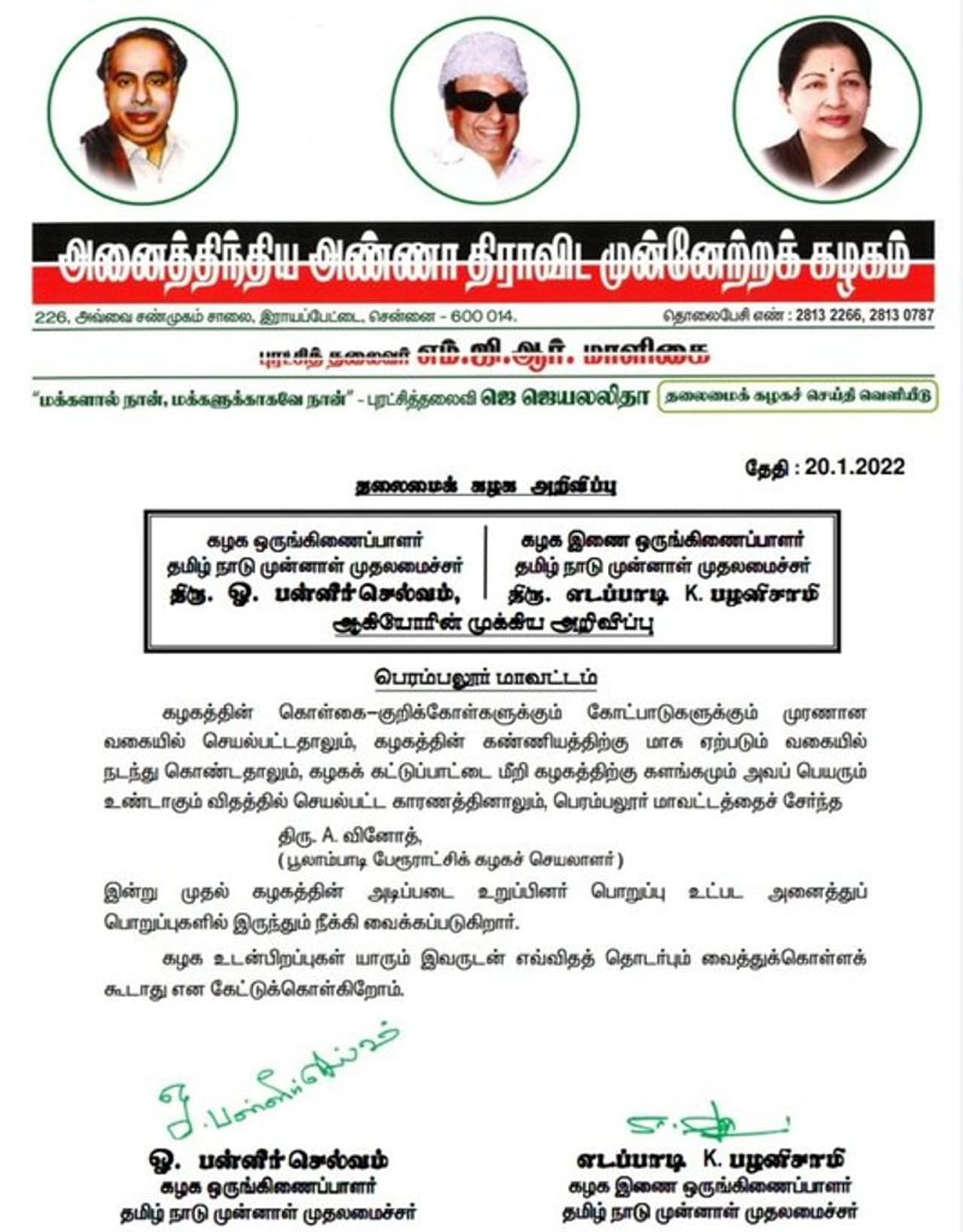 இதுதொடர்பாக அதிமுக ஒருங்கிணைப்பாளர் ஓ.பன்னீர்செல்வம், இணை ஒருங்கிணைப்பாளர் எடப்பாடி பழனிசாமி வெளியிட்டுள்ள அறிக்கையில்;- கழகத்தின் கொள்கை குறிக்கோள்களுக்கும் கோட்பாடுகளுக்கும் முரணான வகையில் செயல்பட்டதாலும் கழகத்தின் கண்ணியத்திற்கு மாசு ஏற்படும் வகையில் நடந்து கொண்டதாலும் கழகக் கட்டுப்பாட்டை மீறி கழகத்திற்கு களங்கமும் அவப் பெயரும் உண்டாகும் விதத்தில் செயல்பட்ட காரணத்தினாலும் பெரம்பலூர் மாவட்டத்தைச் சேர்ந்த A.வினோத் (பூலாம்பாடி பேரூராட்சிக் கழக செயலாளர்) இன்று முதல் கழகத்தின் அடிப்படை உறுப்பினர் பொறுப்பு உட்பட அனைத்துப் பொறுப்புகளிலும் இருந்தும் நீக்கி வைக்கப்படுகிறார்.