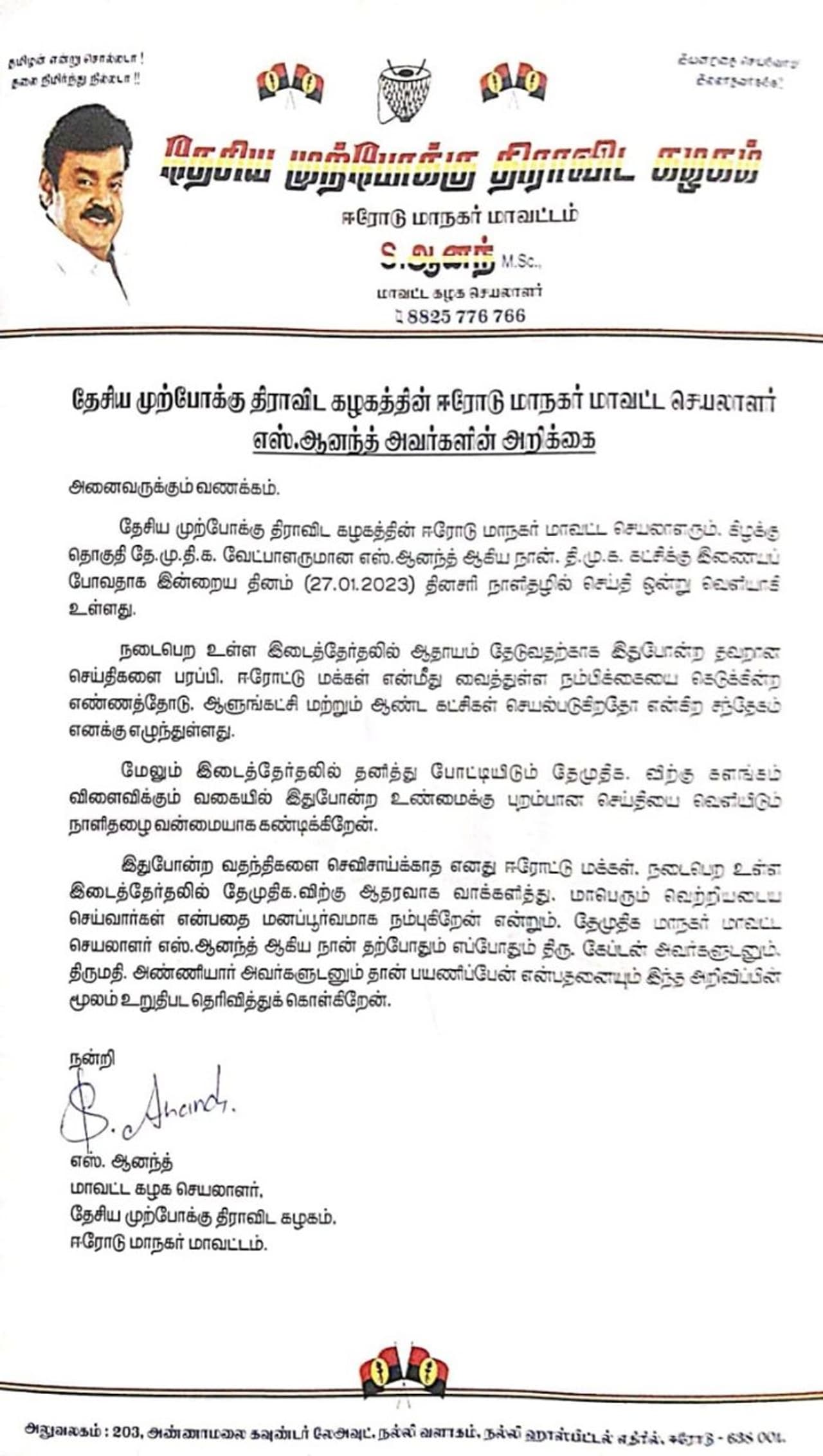 இதுதொடர்பாக தேமுதிக ஈரோடு மாநகர் மாவட்ட செயலாளர் எஸ்.ஆனந்த் வெளியிட்டுள்ள அறிக்கையில்;- தேசிய முற்போக்கு திராவிட கழகத்தின் ஈரோடு மாநகர் மாவட்ட செயலாளரும். கிழக்கு தொகுதி தேமுதிக வேட்பாளருமான எஸ்.ஆனந்த் ஆகிய நான். திமுக கட்சிக்கு இணையப் போவதாக தினசரி நாளிதழில் செய்தி ஒன்று வெளியாகி உள்ளது.