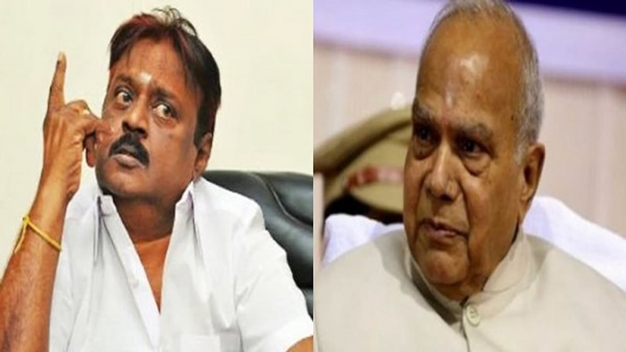 ஏற்கனவே நிர்மலா விவகாரத்தில் சர்ச்சையை ஏற்படுத்திய ஆளுநர் பன்வாரிலால் தற்போது பெண் பத்திரிகையாளர்கள் அவரது கன்னத்தை தட்டிக்கொடுத்தார். இந்த விவகாரம் பூதாகரமானதால் தற்போது கேப்டனும் கேள்வி அம்புகளால் ஆளுனரை துளைத்தெடுததுள்ளார்.