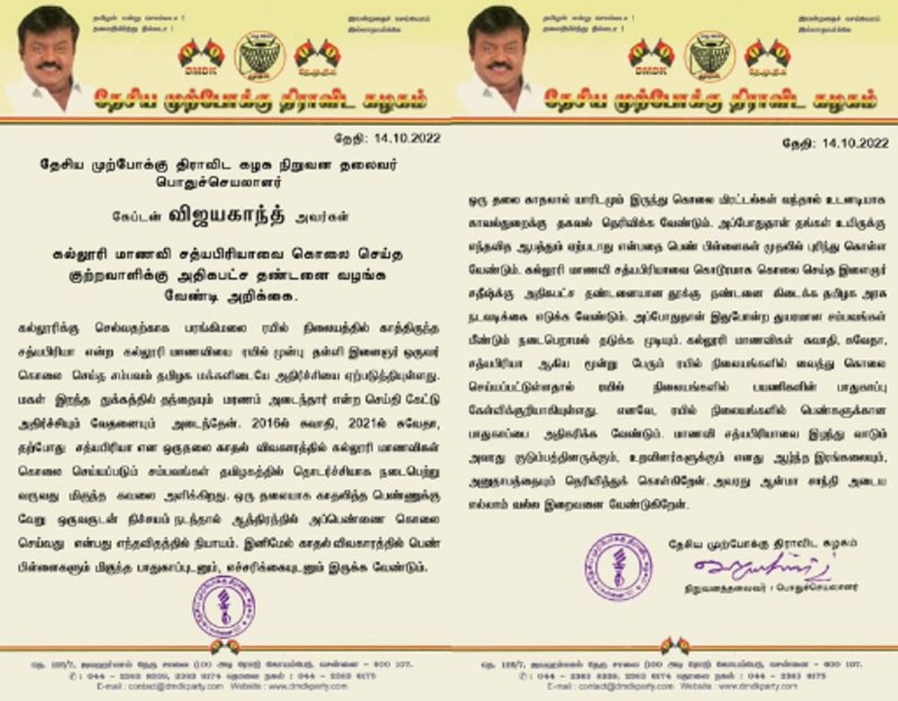 இந்த கொலையை செய்த சதீஸ் தற்போது கைது செய்யப்பட்டுள்ளார். இந்த சம்பவத்திற்கு பல்வேறு அரசியல் கட்சி தலைவர்களும் கண்டனம் தெரிவித்து வருகிறார்கள். இந்நிலையில் தேமுதிக தலைவர் விஜயகாந்த் இதுதொடர்பாக வெளியிட்டுள்ள அறிக்கை ஒன்றினை வெளியிட்டு உள்ளார்.