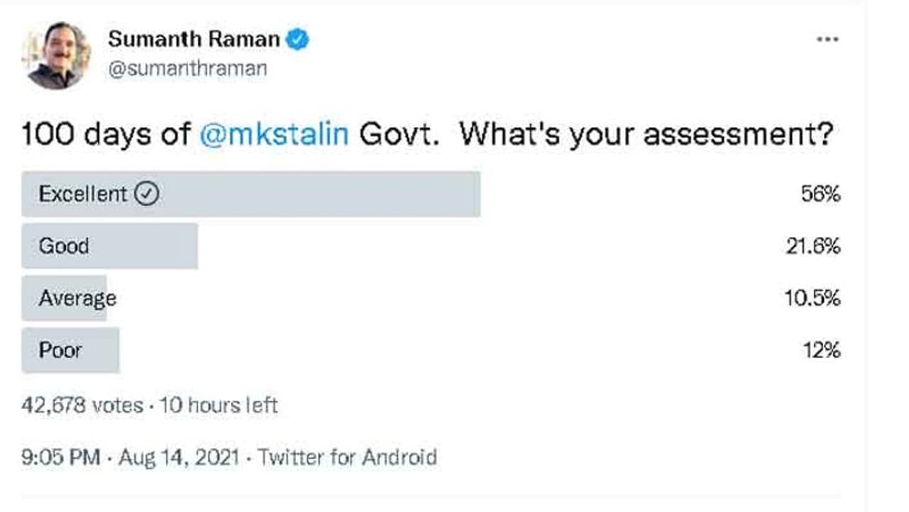 இந்நிலையில், அரசியல் விமர்சகர் சுமந்த்.சி ராமன் அவரது டுவிட்டர் பக்கத்தில்;- ஸ்டாலினுடைய 100 நாள் ஆட்சியை பற்றி கருத்து கணிப்பு நடத்தினார். அதில், சிறப்பு (Excellent), நன்று (Good),சராசரி (Average),மோசம் (Poor) என்ற நான்கு பிரிவுகளின் கீழ் கருத்து கணிப்பை நடத்தினார். இதில், 42,000க்கும் மேற்பட்ட பங்கேற்ற இந்த கருத்து கணிப்பில் 56 சதவீத பெயர் சிறப்பு (Excellent)என்றும், 22 சதவீத பெயர் நன்று (Good) என்றும், 10.5 சதவீத பெயர் சராசரி (Average)என்றும், 12 சதவீத பெயர் மோசம் (Poor) என்றும் கருத்து கணிப்பில் கூறியிருக்கிறார்கள். இதில், மு.க.ஸ்டாலினின் 100 ஆட்சியை பெரும்பாலானோர் பாராட்டியுள்ளனர் என்பது குறிப்பிடத்தக்கது.
