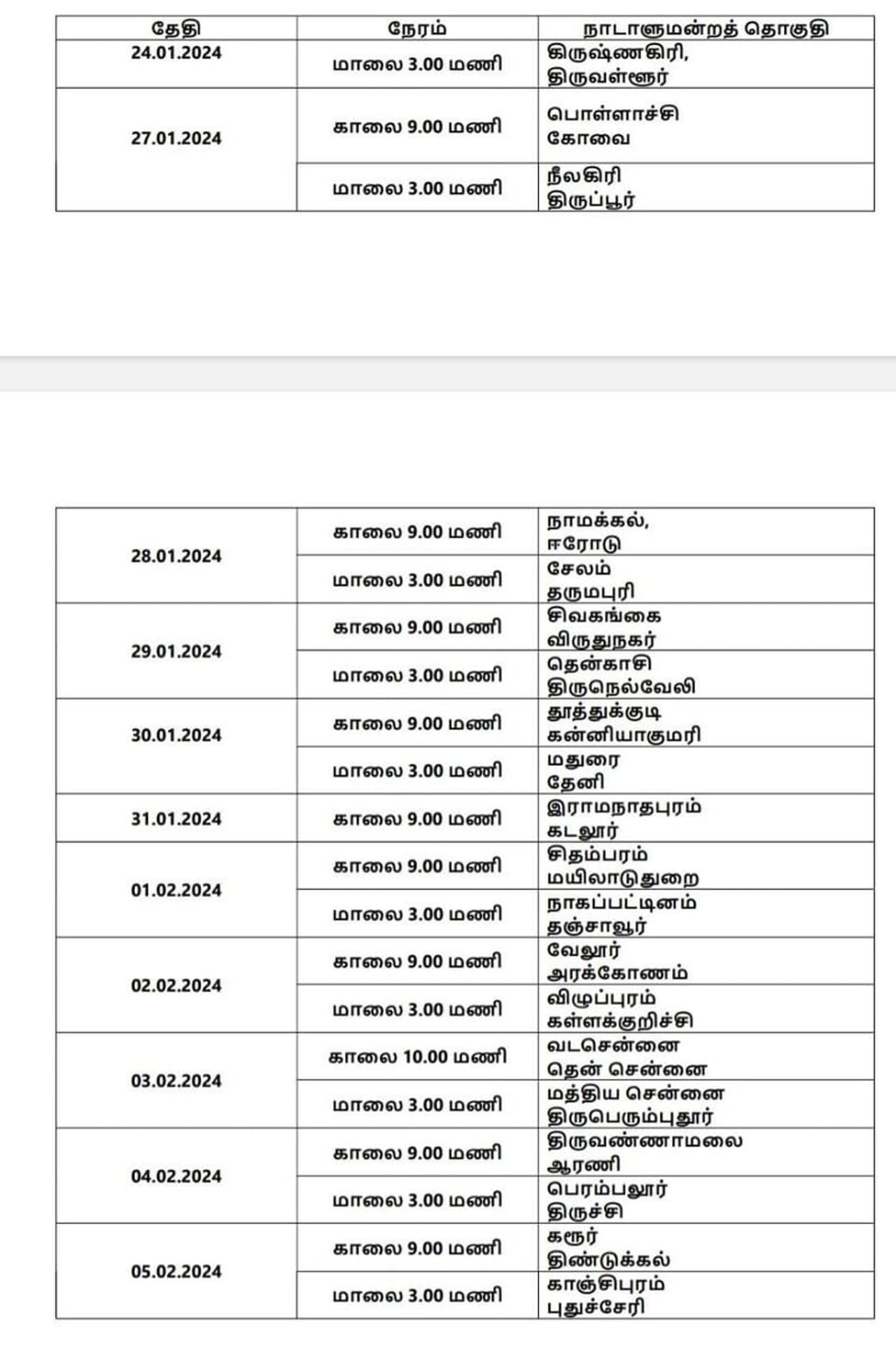 இதற்கான தேதி மற்றும் தொகுதிக்கான பட்டியலையும் திமுக தலைமை வெளியிட்டுள்ளது. வருகின்ற 24 ஆம் தேதி முதல் இந்த பணியானது தொடங்குகிறது அதன்படி 24-ஆம் தேதி மாலை 3 மணிக்கு கிருஷ்ணகிரி, திருவள்ளூர் தொகுதி நிர்வாகிகளையும், 27ஆம் தேதி காலை பொள்ளாச்சி கோவை நிர்வாகிகளையும், மாலை நீலகிரி திருப்பூர் மாவட்ட தொகுதி நிர்வாகிகளையும் சந்திக்க உள்ளது. இதேபோல 28ஆம் தேதி நாமக்கல், ஈரோடு,சேலம், தர்மபுரி ஆகிய தொகுதி நிர்வாகிகளையும் சந்திக்க உள்ளனர்.