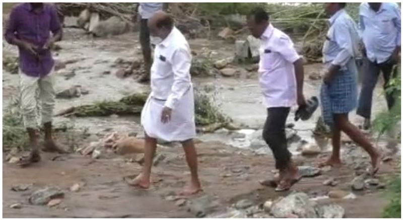 பொன்னப்பள்ளி கிராமத்தில் தடுப்பணையை பார்வையிட சில தினங்களுக்கு முன்பு சென்றார். மழை பெய்ததால் அந்தப் பாதை சகதியாக இருந்தது. எனவே, எம்.எல்.ஏ. விஷ்வநாதன் செருப்பை கழற்றிவைத்துவிட்டு நடந்து சென்றார். ஆனால், திமுகவைச் சேர்ந்த வெங்கடசமுத்திரம் ஊராட்சி செயலாளர் சங்கர், எம்எல்ஏவின் செருப்பை கையில் துாக்கிக்கொண்டு உடன் சென்றார்.