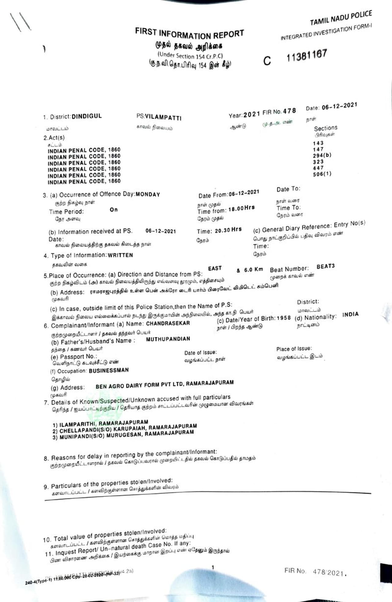 இவர்கள் பென் அக்ரோ டைரி பார்ம் நிறுவனத்தை அங்கு நடத்தி வருகிறார்கள். இந்த நிறுவனத்தின் நிர்வாக இயக்குநராக சந்திரசேகரின் மகன் ஜோஸ்வா இருக்கிறார். அவரோடு ப்காமேஷ், சுனில் குமார் ஆகிய மூவரும் இந்த நிறுவனத்தை ஒட்டிய கரட்டுப்பகுதியில் நடைபயிற்சிக்கு சென்றுள்ளனர். அப்போது மாலை 5மணிக்கு ராமராஜபுரம் பகுதியை சேர்ந்த 4 பேர் எங்களது ஊழியர்களிடம் வம்பு செய்தனர். அவர்களை விசாரிக்க எங்கள் நிறுவனத்திற்கு அழைத்து வந்தோம்.