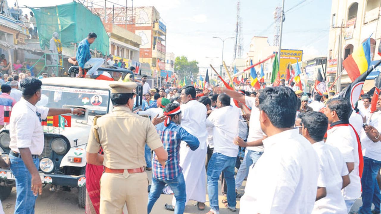 இதற்கிடையே வெங்கமேடு எம்.ஜி.ஆர். சிலையில் இருந்து மாவட்ட செயலாளரும், போக்கு வரத்து துறை அமைச்சருமான எம்.ஆர்.விஜயபாஸ்கர் தலைமையிலான அ.தி.மு.க.வினர், வேட்பாளர் தம்பிதுரையை அழைத்து கொண்டு ஊர்வலமாக கரூர் நோக்கி வந்தனர். அப்போது இடையில் தி.மு.க.-காங்கிரஸ் கூட்டணியினர் நின்று கொண்டிருந்ததால் பதற்றமான சூழல் ஏற்பட்டது. இந்நிலையில் எதிரெதிரே நின்ற அ.தி.மு.க.-தி.மு.க. கூட்டணியினர் பல்வேறு கண்டன கோஷங்களை எழுப்பினர்.