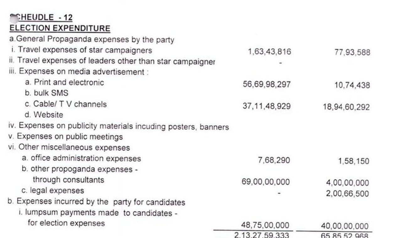 பிரச்சாரத்திற்காக தொலைக் காட்சி மற்றும் அச்சு ஊடகங்களுக்கு 56,69,98,297 செலவு செய்யப்பட்டதாகவும், குறுஞ்செய்தி விளம்பரத்திற்கு ரூ. 10,74,438 , கேபிள் டிவி சேனல்களுக்கு 37,11,48,929, இணையதளங்களுக்கு 18,94,60,292, அதேபோல் பேனர், சுவர் விளம்பரம் ,பொதுக்கூட்டங்கள் போன்றவற்றை நடத்துவதற்கு 7,68,290, அதேபோல் தேர்தல் வியூககர்களுக்கு 69,00,00,000 வழங்கப்பட்டதாகவும், தேர்தலில் போட்டியிட்ட வேட்பாளர்களுக்கான நிதி 48,75,00,000 வழங்கப்பட்டதாகவும் அதில் கூறப்பட்டுள்ளது குறிப்பிடத்தக்கது.
