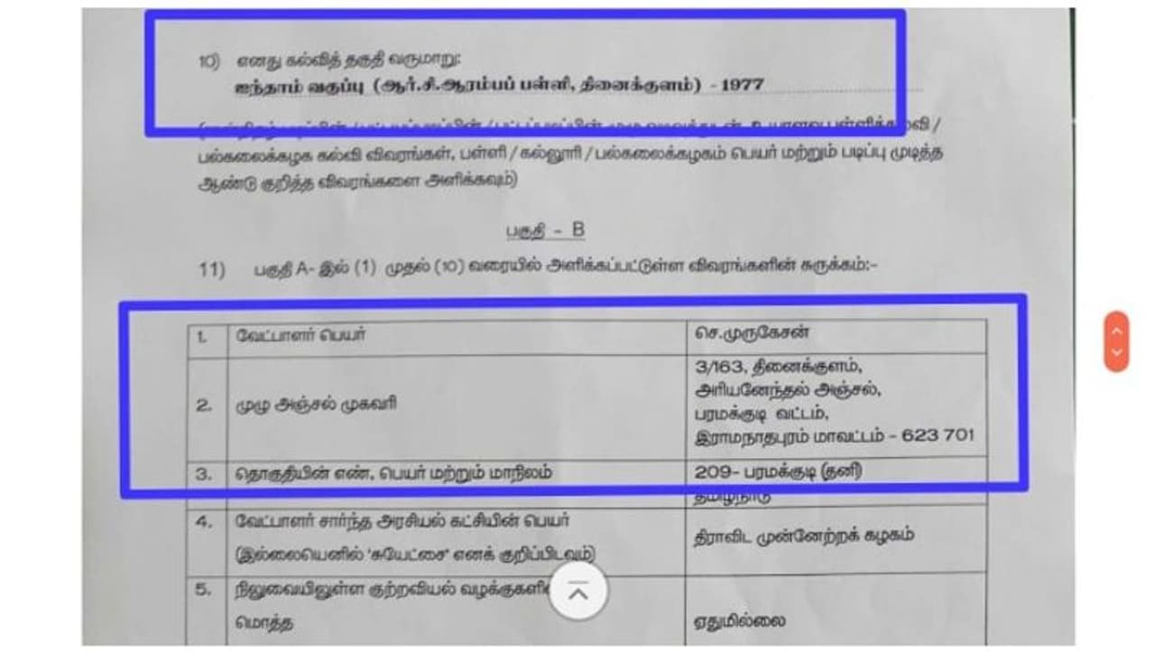 ஆனால் அவர்கள் அளித்துள்ள தேர்தலுக்கான வேட்பு மனுவில் முருகேசன் 5ம் வகுப்பு படித்துள்ளதாகவும், காதர் பாட்ஷா முத்துராமலிங்கம் 12ம் வகுப்பு மட்டுமே படித்துள்ளதாகவும் அபிடவிட்டில் தெரிவித்துள்ளனர். இந்த தகவல் வெளியாகி இருவர் மீதும் சர்ச்சை எழுந்துள்ளன.