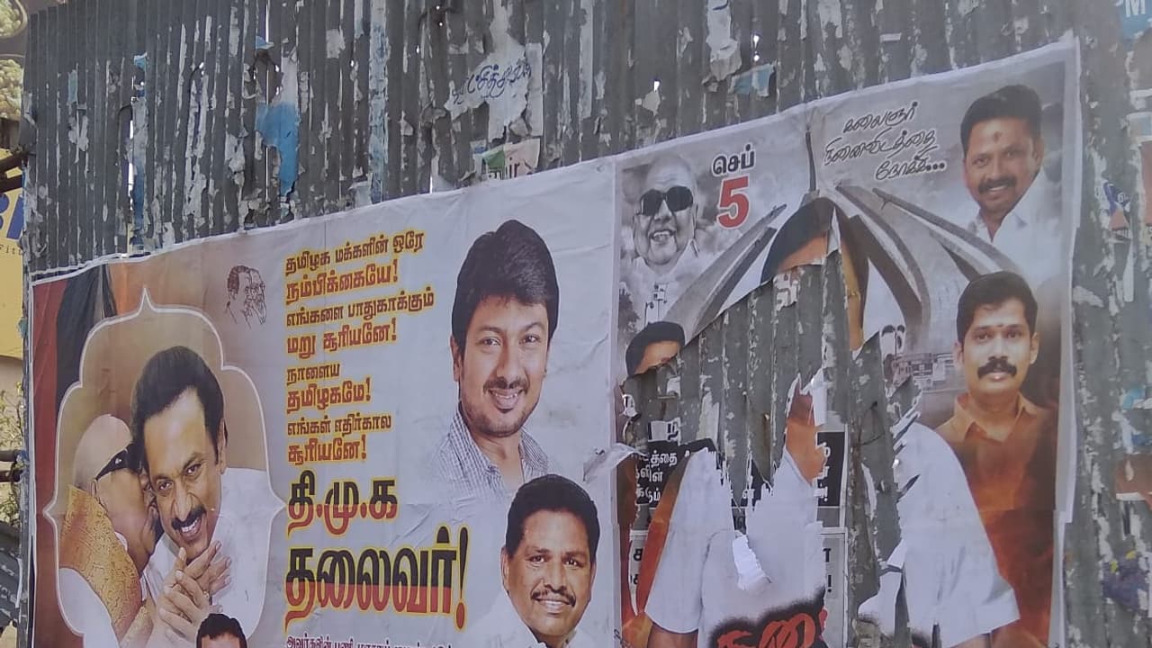 திமுக தலைமைக் கழகமான அண்ணா அறிவாலயம் எதிரிலேயே உள்ள சுவர்களிலும், போக்குவரத்து தடுப்புகளிலும் போஸ்டர்கள் ஓட்டப் பட்டுள்ளனனர்.