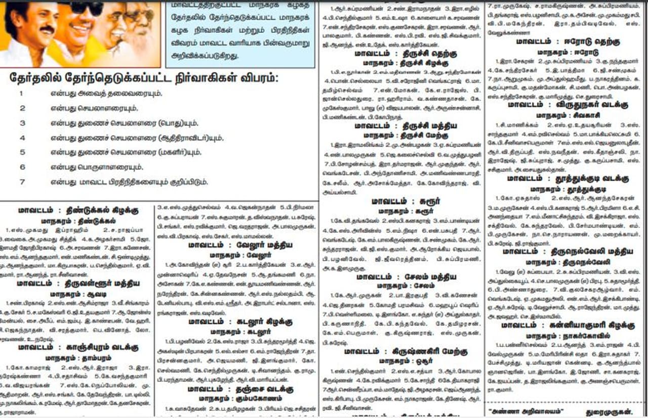 இந்த 21 மாநகராட்சிகளில் சென்னை, கோவை தவிர மற்ற மாநகர கழக தேர்தல் முடிவு இன்றைய முரசொலியில் வெளியாகியுள்ளது. இதில், ஆவடி மாநகர செயலாளராக பால்வளத்துறை அமைச்சர் ஆவடி நாசரின் மகன் ஆசிம் ராஜா தேர்ந்தேடுக்கப்பட்டுள்ளார். திருச்சி மாநகர செயலாளராக, திருச்சி மேயர் அன்பழகன் தேர்ந்தெடுக்கப்பட்டுள்ளார். தஞ்சாவூரில் சட்டமன்ற உறுப்பினர் நீலமேகம் பொறுப்பில் இருந்து விடுவிக்கப்பட்டு புதிதாக இளைஞரணியை சார்ந்த சண்.ராமநாதன் புதிய மாநகர செயலாளராக தேர்ந்தெடுக்கப்பட்டுள்ளார்.