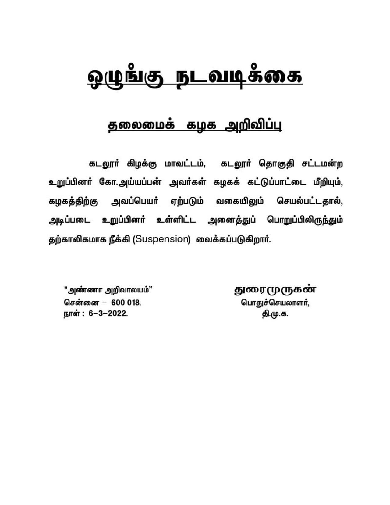 கடலூர் திமுக எம்.எல்.ஏ கோ. ஐயப்பனை கட்சியின் அடிப்படை உறுப்பினர் உள்ளிட்ட அனைத்து பொறுப்புகளில் இருந்தும் தற்காலிகமாக நீக்கி திமுக பொதுச்செயலாளர் துறைமுருகன் அறிவிப்பை வெளியிட்டுள்ளார்.