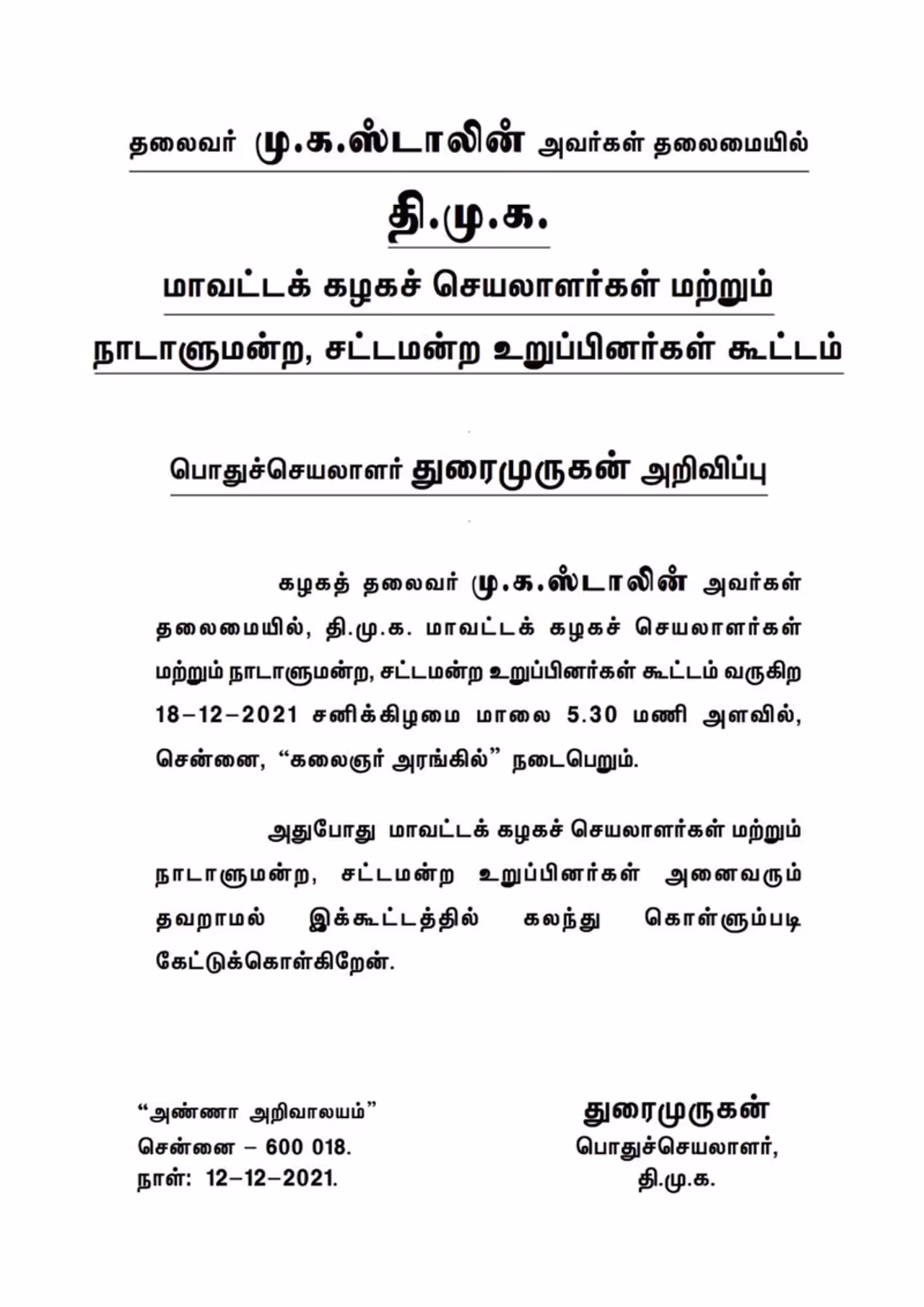 திமுக பொதுச்செயலாளர் துரைமுருகன் வெளியிட்டுள்ள அறிக்கையில், ‘திமுக தலைவர் மு.க.ஸ்டாலின் தலைமையில், தி.மு.க. மாவட்டக் கழகச் செயலாளர்கள் மற்றும் நாடாளுமன்ற, சட்டமன்ற உறுப்பினர்கள் கூட்டம் வருகிற 18-12-2021 சனிக்கிழமை மாலை 5.30 மணி அளவில், சென்னை, “கலைஞர் அரங்கில்” நடைபெறும்.