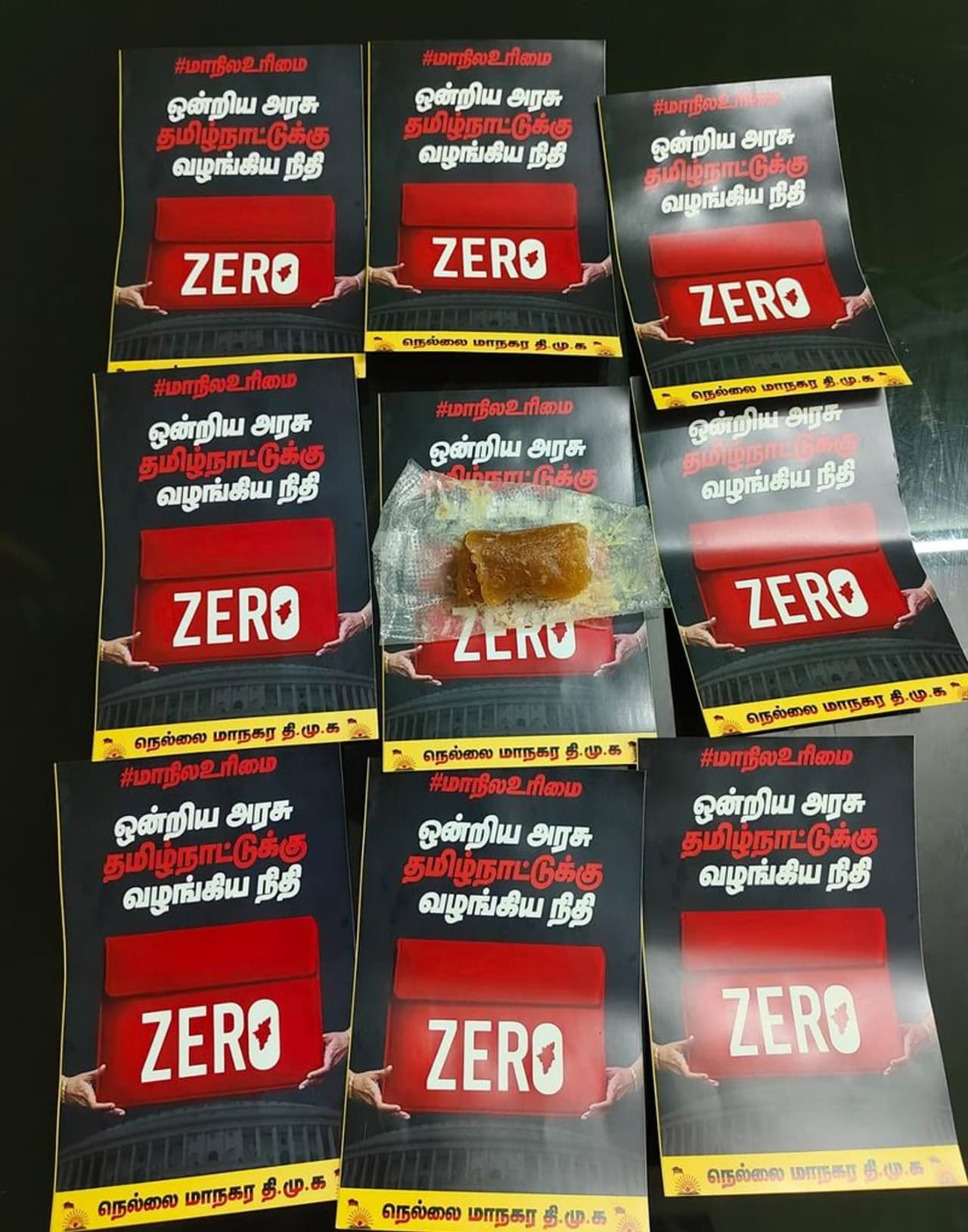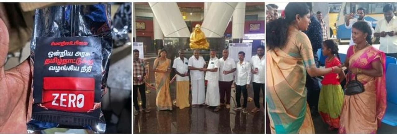 சென்னை கிளாம்பாக்கத்தில் உள்ள பேருந்து நிலையத்தில் வரும் பயணிகள், ஓட்டுநர்கள் உள்ளிட்டவர்களுக்கு அல்வா வழங்கினர். அல்வாவோடு இணைக்கப்பட்ட நோட்டீசில் ஒன்றிய அரசு தமிழகத்திற்கு வழங்கிய நிதி ZERO என அச்சடித்து அதில் ஒரு அல்வா துண்டை இணைந்து வழங்கி வருகின்றனர்.