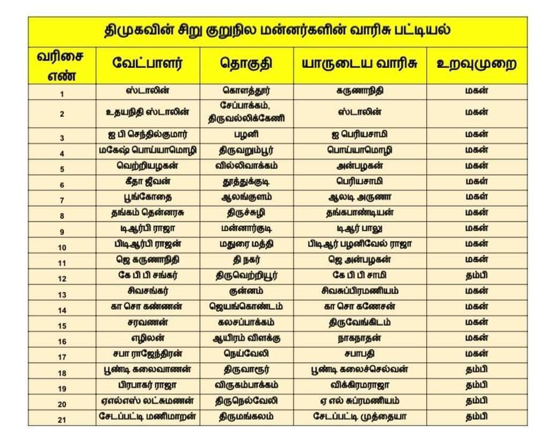 தி.மு.க சார்பில் சட்டப்பேரவை தேர்தலில் போட்டியிடவுள்ள 173 வேட்பாளர்களின் பட்டியலை தி.மு.க தலைவர் ஸ்டாலின் வெளியிட்டார். இதில் புதுமுகங்களுக்கு அதிக வாய்ப்புகள் வழங்கப்படும் என்ற எதிர்பார்ப்பு தொண்டர்களிடையே நிலவி வந்தது. இதற்கு முற்றிலும் மாறாக ஏற்கனவே போட்டியிட்ட முன்னாள் அமைச்சர்கள் மற்றும் அவர்களது வாரிசுகளுக்கு வாய்ப்புகள் வழங்கப்பட்டுள்ளது. பட்டியலில் 21 பேர் ஏற்கனவே தி.மு.கவில் பல்வேறு பொறுப்புகளில் உள்ளவர்களுக்கும் சட்ட மன்ற தேர்தலில் ஏற்கனவே போட்டியிட்டவர்களுக்கும் அவர்களின் வாரிசுகளுக்கும் இடங்கள் வழங்கப்பட்டுள்ளது. இதில் நேரிடை வாரிசுகள் 16 பேருக்கும் 5 பேர் தங்களது குடும்ப உறுப்பினர்களுக்கும் இடங்கள் வழங்கப்பட்டுள்ளது. குறுநில மன்னர்கள் போன்று வாழையடி வாழையாக ஒரே குடும்பத்தை சேர்ந்தவர்களுக்கே தேர்தலில் போட்டியிட வாய்ப்புகள் வழங்கப்பட்டு வருவது தி.மு.கவின் அடிமட்ட தொண்டர்களை கடுப்படைய செய்துள்ளது. கருணாநிதி காலத்தில் இருந்து தி.மு.கவின் மாவட்ட செயலாளர்கள் அந்த பகுதியின் குறுநில மன்னர்களாக செயல்பட்டு வந்தனர். அது ஸ்டாலின் காலத்திலும் தொடர்ந்து நடைபெற்று வருகிறது. இதை முறியடிக்க முடியாதது ஸ்டாலினின் பலவீனத்தையே காட்டுகிறது. இந்த பலவீனம் சட்ட பேரவை தேர்தலிலும் எதிரொலிப்பதாக அரசியல் விமர்சகர்கள் தெரிவிக்கின்றனர். தி.மு.க குடும்ப கட்சி என்று ஏற்கனவே அரசியல் கட்சிகள் விமர்சனம் செய்து வரும் நிலையில் 21 வாரிசுகளுக்கு தேர்தலில் போட்டியிட இடம் கொடுத்துள்ளது, எதிர்கட்சிகளின் விமர்சனத்தை உண்மையாக்கியுள்ளது.