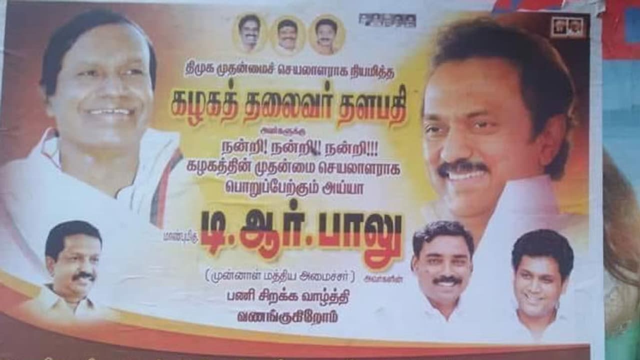 இதனை தொடர்ந்து ஸ்டாலின் கட்சியின் முக்கியப் பதவியை பெற்ற பிறகு, கலைஞர் இல்லாமல் போஸ்டர் அடிக்கப்படுவதில்லை. ஆனால் தற்போது திருவாரூரில் தி.மு.கவினர் அடித்து ஒட்டியுள்ள போஸ்டர்களில் கருணாநிதியின் புகைப்படம் இல்லை. தி.மு.க முதன்மைச் செயலாளராக கடந்த வாரம் டி.ஆர்.பாலு நியமிக்கப்பட்டார். இதற்கு நன்றி தெரிவித்து திருவாரூர், மன்னார்குடி உள்ளிட்ட பகுதிகளில் தி.மு.கவினர் போஸ்டர் அடித்து ஒட்டியுள்ளனர்.