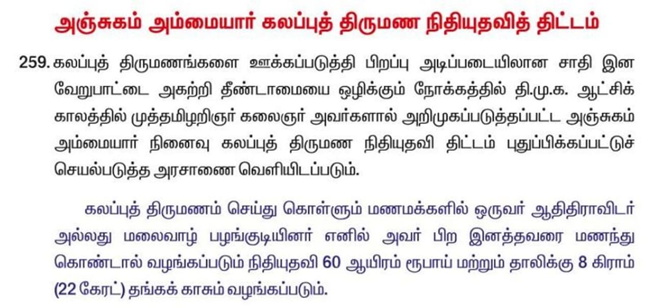தேர்தல் அறிக்கையில் 259வதாக குறிப்பிடப்பட்டுள்ள அம்சத்தில், “கலப்புத் திருமணம் செய்து கொள்ளும் மணமக்களில் ஆதிராவிடர் மற்றும் பழங்குடியினர் பிற இனத்தவரை மணந்து கொண்டால் 60 ஆயிரம் ரூபாய் நிதியுதவி மற்றும் 8 கிராம் தங்கக் காசு வழங்கப்படும்” என்று தெரிவிக்கப்பட்டுள்ளது. இந்த அறிவிப்பு தமிழக மக்களை பெரும் அச்சத்தில் ஆழ்த்தியுள்ளது. அமைதியாக உள்ள தமிழகத்தில் இளம் ஆண்களை தூண்டி , சாதிய மோதல்களை உருவாக்க தி.மு.க திட்டமிட்டுள்ளதாக பொது மக்கள் கருதுகின்றனர். அமைதிப் பூங்காவாக தமிழகத்தில் வகுப்பு மோதல்களை உருவாக்கி அதன் மூலம் ஆட்சிக்கு வந்துவிடலாம் என்று திமுக செயல்படுவதாக சமூக வலைதளங்களில் பல்வேறு தரப்பினரும் கருத்துக்களை தெரிவித்து வருகின்றனர்.