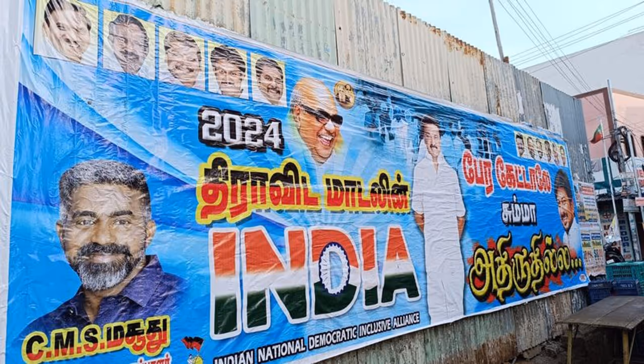 அதாவது Indian National Democratic Inclusive Alliance- இந்திய தேசிய ஜனநாயக ஒருங்கிணைந்த கூட்டணி என்பதை INDIA என குறிப்பிட்டுள்ளனர். இந்த பெயருக்கு நாடு முழுவதும் பெரும் வரவேற்பு கிடைத்துள்ளது. இந்நிலையில் கோவையில் திமுக இளைஞரணியினர் INDIA குறித்து 20 அடி அகலம் 6 அடி உயரத்திற்கு போஸ்டர்களை ஒட்டி உள்ளனர். அந்த போஸ்டரில் "2024 திராவிட மாடலின் INDIA. பேர கேட்டாலே சும்மா அதிருதில்ல..." என்ற வாசகங்களும் காங்கிரஸ் கூட்டணி கட்சியில் உள்ள தலைவர்களின் புகைப்படங்கள், திமுக தலைவர் மு.க.ஸ்டாலின், திமுக இளைஞரணி செயலாளர் உதயநிதி ஸ்டாலின் ஆகியோரின் புகைப்படங்கள் இடம்பெற்றுள்ளன. இந்த போஸ்டர்கள் கோவை லங்கா கார்னர், ரேஸ் கோர்ஸ், கோட்டைமேடு உள்ளிட்ட இடங்களில் ஒட்டப்பட்டுள்ளன.