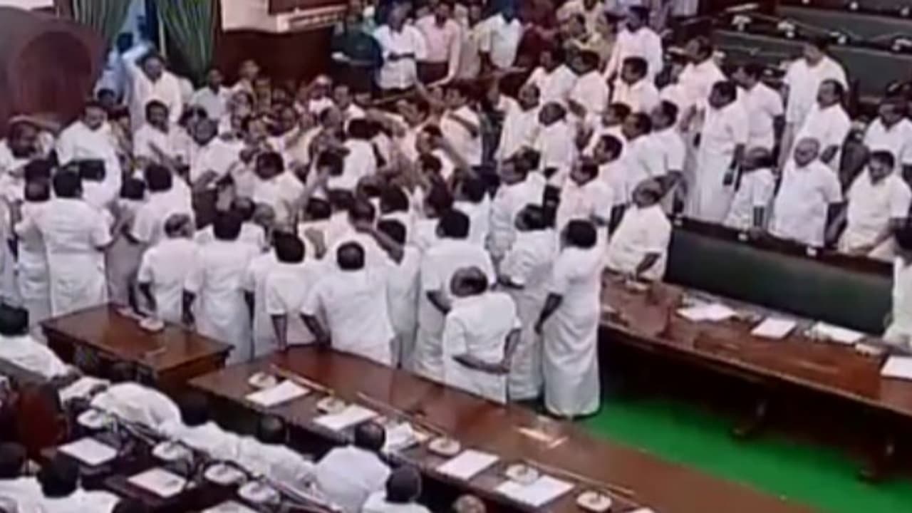 திமுக உறுப்பினர்கள் சபாநாயகரை சுற்றி நின்று கோஷமிட்டனர். இதனால் கோபமுற்ற சபாநாயகர் அவை விட்டு வெளியேற முயற்சி செய்தார்.