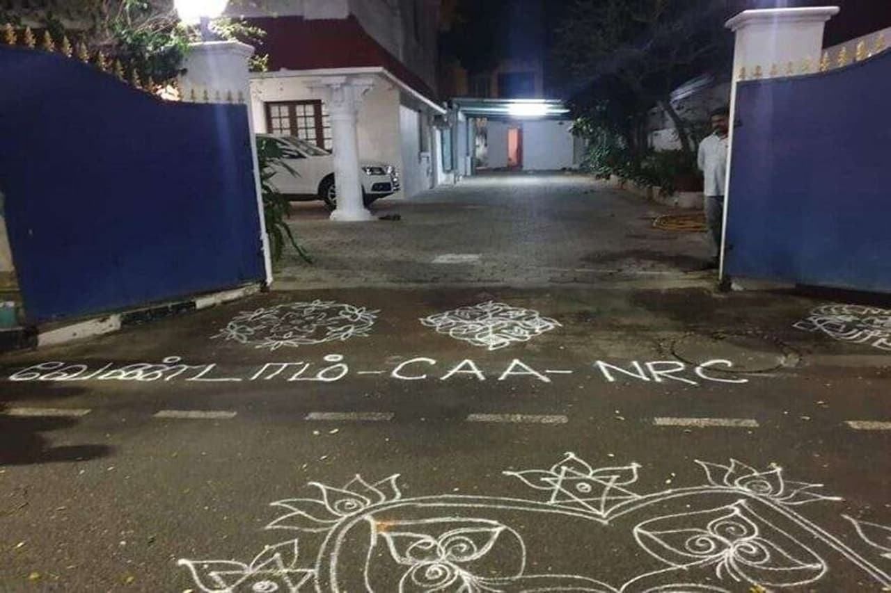குடியுரிமைத் திருத்த சட்டத்துக்கு எதிராக தனது வீட்டு வாசலில் கோலம் போட்டு எதிர்ப்பு தெரிவித்துள்ளார் திமுக எம்.பி. கனிமொழி.