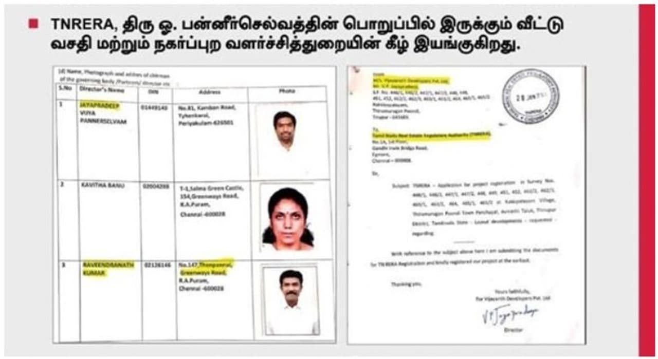 இதுதொடர்பாக மு.க. ஸ்டாலின் வெளியிட்டுள்ள அறிக்கையில், “துணை முதல்வர் ஓ.பன்னீர்செல்வத்தின் மகன்கள் ரவீந்திரநாத் குமார், ஜெயபிரதீப் இயக்குநர்களாக இருக்கும் ‘விஜயந்த் டெவலப்பர்ஸ் பிரைவேட் லிமிடெட்’ நிறுவனம், தங்களது பிராஜெக்ட்டுகளை பதிவு செய்துகொள்ள தமிழ்நாடு ரியல் எஸ்டேட் அத்தாரிட்டியிடம் கடந்த ஜனவரி 20 அன்று விண்ணப்பித்திருக்கிறது.