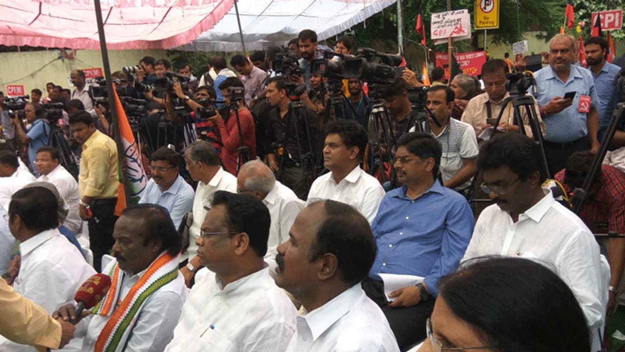 காங்கிரஸ், மதிமுக, சமாஜ்வாதி, திரிணாமுல் காங்கிரஸ், மார்க்சிஸ்ட் கம்யூனிஸ்ட், மதசார்பற்ற ஜனதா தளம், இந்திய கம்யூனிஸ்ட் , பகுஜன் சமாஜ் ஆகிய கட்சி நிர்வாகிகள் இந்த போராட்டத்தில் கலந்து கொண்டுள்ளனர். திமுக மக்களவை தலைவர் டி.ஆர்.பாலு தலைமையில் இந்த போராட்டம் நடைபெற்று வருகிறது.