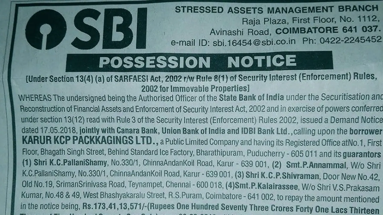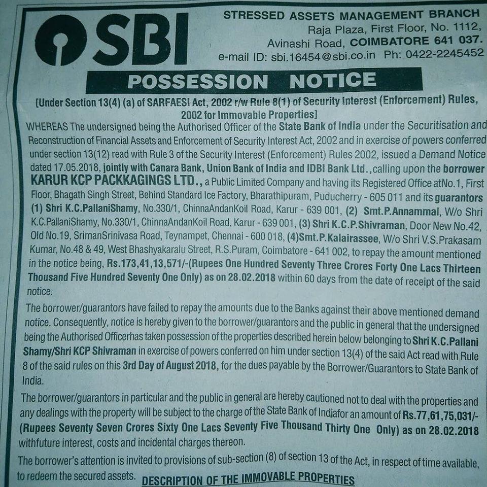 புதுச்சேரியில் உள்ள கரூர் கே.சி.பி பேக்கேஜிங்ஸ் கம்பெனிக்காக தனது பெயர், மனைவி, தம்பி, தம்பி மனைவி என 4 பேரின் ஷ்யூரிட்டியில் இந்த கடனை வாங்கியுள்ளதாக தெரிகிறது. இதற்கு முன்னதாக இந்த கடனை 60 நாள்களுக்குள் திருப்பி செலுத்தும் படி கடந்த 17.05.2018 அன்று பேங்க் நோட்டீஸ் விட்டது. ஆனால், 60 நாள்கள் கடந்தும் கே.சி.பி இந்த லோனை திருப்பிச் செலுத்தாததால், ஒட்டுமொத்த வங்கியும் கூட்டாக சேர்ந்து பாரத ஸ்டேட் வங்கியின் சார்பில் ஜப்தி நோட்டீசை வெளியிட்டு திமுக வட்டாரத்தில் அதிர்ச்சியை கிளப்பியுள்ளது.