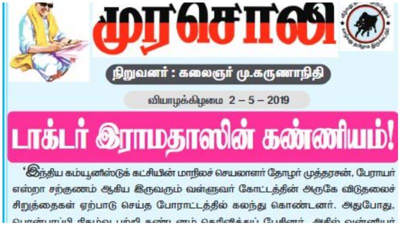 திமுக சாதி கட்சி இல்லை என்றும் குறிப்பிட்டுள்ள முரசொலி அறிக்கை, கற்பனையான கதைகளை பரப்புவது ராமதாசின் தொடர் பணியாக இருக்கிறது. முத்தரசன், எஸ்றா சற்குணம் உள்ளிட்ட திமுக அணியைச் சேர்ந்த தலைவர்களின் உயிருக்கு ஆபத்து நேருமானால் அதற்கு முழு பொறுப்பு ராமதாஸ் தான்’’ என்று எச்சரிக்கை விடுத்துள்ளது.