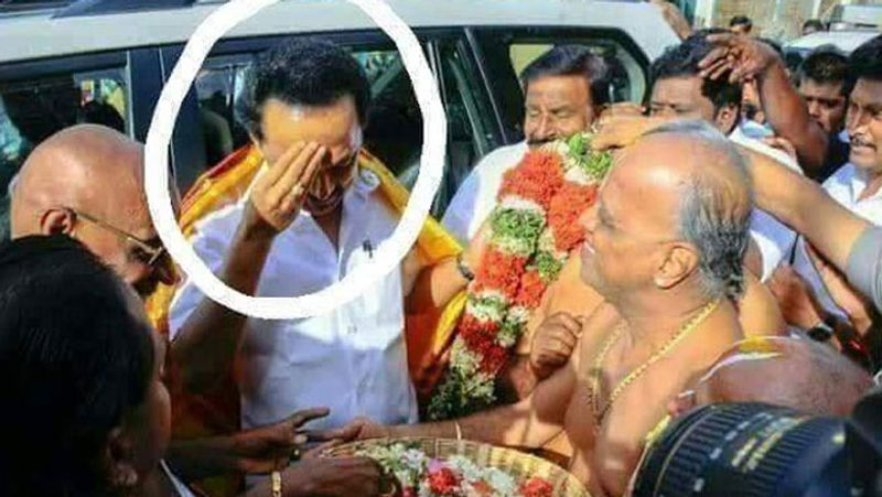 ஆனால் ஸ்டாலினோ அந்த விபூதி மற்றும் குங்குமத்தை பவ்வியமாக பெற்றுக் கொண்டு வெளியே வந்தார். தற்போது ஸ்ரீரங்கத்தில் பிராமணர் ஒருவர் வைத்த விபூதியை அழித்த ஸ்டாலின் தேவர் ஒருவர் வைத்த விபூதியை அழிக்காதது ஏன்? வாக்கு வங்கி பாதிக்கப்படும் என்கிற பயத்திலா என்று படத்துடன் சமூக வலைதளங்களில் கேள்வி எழுப்பப்பட்டு வருகிறது.