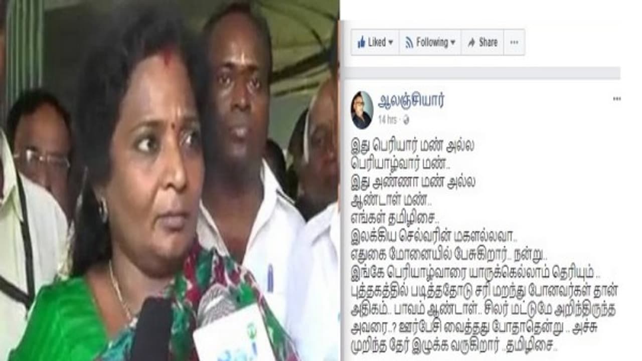என எதுகை மோனையில் தமிழக பாஜக தலைவர் தமிழிசை பேசியதற்கு திமுக ஆதரவாளர் ஒருவர் தனது முகநூல் பக்கத்தில் ஒரு பதிவை வெளியிட்டுள்ளார். அதில்,