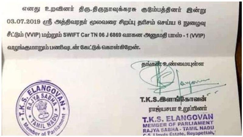 இதேபோல் தங்களது குடும்பத்தினரும், உறவினர்களும் அத்திவரதரை தரிசிக்க சிறப்பு அனுமதி கேட்டு கடிதம் எழுதி வருகின்றனர் திமுக எம்.பிக்கள். ஜெகத்ரட்சகன் காஞ்சிபுரம் மாவட்ட ஆட்சியருக்கு எழுதியுள்ள கடிதத்தில் தனது மனைவி அனுசுயா மற்றும் குடும்ப உறுப்பினர்கள் 6 பேரை சிறப்பு தரிசனம் செய்ய அனுமதிக்குமாறும் விஐபி பாஸ் வழங்குமாறும் கடிதம் எழுதியுள்ளார். அதே போல் திமுக ராஜ்யசபா எம்.பி., டி.கே.எஸ்.இளங்கோவன் காஞ்சிபுரம் மாவட்ட ஆட்சியருக்கு தங்களது உறவினர்கள் தரிசிக்க சிறப்பு தரிசனத்திற்கு விஐபி பாஸ் கேட்டு கடிதம் எழுதியுள்ளார். இந்தக் கடிதங்கள் சமூக வலைதளங்களில் வைரலாகி வருகிறது.