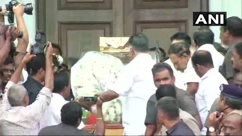 இந்நிலையில் மறைந்த கருணாநிதியின் உடலுக்கு முதலமைச்சர் எடப்பாடி பழனிசாமி, துணை முதலமைச்சர் ஓபிஎஸ், நாடாளுமன்ற துணை சபாநாயகர் தம்பிதுரை, அமைச்சர்கள் செங்கோட்டையன், ஜெயகுமார், தங்கமணி வேலுமணி, காமராஜ், திண்டுக்கல் சீனிவாசன், தமிழக சட்டப் பேரவை சபாநாயகர் தனபால், துணை சபாநாயகர் பொள்ளாச்சி ஜெயராமன் உள்ளிட்டோர் மலர் வளையம் வைத்து அஞ்சலி செலுத்தினர்.