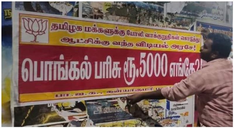 மேலும் பொங்கல் பரிசில் புளியில் பல்லி இருந்ததாகவும், வெல்லம் உருகுகிறது என்றும் அதிமுக, பாஜக திமுக அரசை விமர்சித்தன. இந்தப் பொருட்கள் எங்கு கொள்முதல் செய்யப்பட்டன என்றும் இக்கட்சிகள் கேள்வி எழுப்பின. இந்நிலையில் பாஜக செல்வாக்காக உள்ள கன்னியாகுமரி மாவட்டம் முழுவதும் பாஜகவினர் பொங்கல் பரிசு கேட்டு போஸ்டர் அடித்து ஒட்டினர். அதில், “‘தமிழக மக்களுக்கு போலியான வாக்குறுதிகள் கொடுத்து ஆட்சிக்கு வந்த விடியல் அரசே, பொங்கல் பரிசு ரூபாய் 5000 எங்கே?’ என கேள்வி எழுப்பியது பாஜக. பாஜகவினர் ஒட்டிய இந்த போஸ்டர் திமுகவினர் மத்தியில் கோபத்தை ஏற்படுத்தியது.