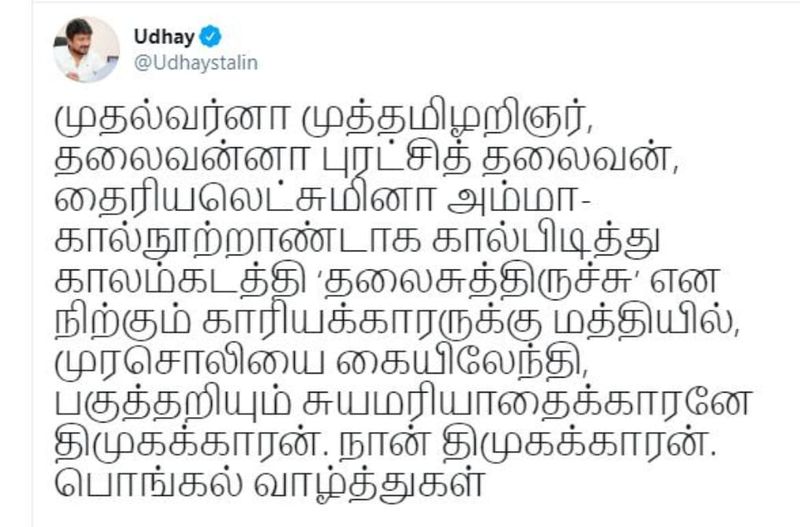 தைரியலட்சுமி என்றால் அம்மா , தலைவர் என்றால் எம்ஜிஆர் , முதலமைச்சர் என்றால் முத்தமிழறிஞர் மு.கருணாநிதி என திமுக இளைஞரணி செயலாளர் உதயநிதி ஸ்டாலின் வித்தியாசமான முறையில் பொங்கல் வாழ்த்து தெரிவித்திருப்பது திமுகவினர் மத்தியில் மட்டுமல்ல அதிமுகவினரையும் கவர்ந்துள்ளது . அவரின் பொங்கல் வாழ்த்து துக்ளக் விழாவில் பேசிய ரஜினிகாந்துக்கு பதிலடி எனவும் பரபரப்பாக பேசப்படுகிறது . நடிகர் ரஜினிகாந்த் துக்ளக் ஆண்டு விழாவில் முரசொலி பத்திரிக்கை துக்ளக் பத்திரிக்கை யுடன் ஒப்பிட்டு பேசியிருப்பது ரஜினிகாந்தை கடும் விமர்சனத்திற்கு உள்ளாகி இருக்கிறது . நடிகர் ரஜினிகாந்தை பலரும் கடுமையாக விமர்சித்து வருகின்றனர் .துக்ளக் பத்திரிகையின் 50வது ஆண்டு விழா சென்னையில் நடந்தது . அதில் கலந்து கொண்ட துணைகுடியரசுத் தலைவர் வெங்கையா நாயுடு நடிகர் ரஜினிகாந்த் ஆகியோர் கலந்து கொண்டனர் .